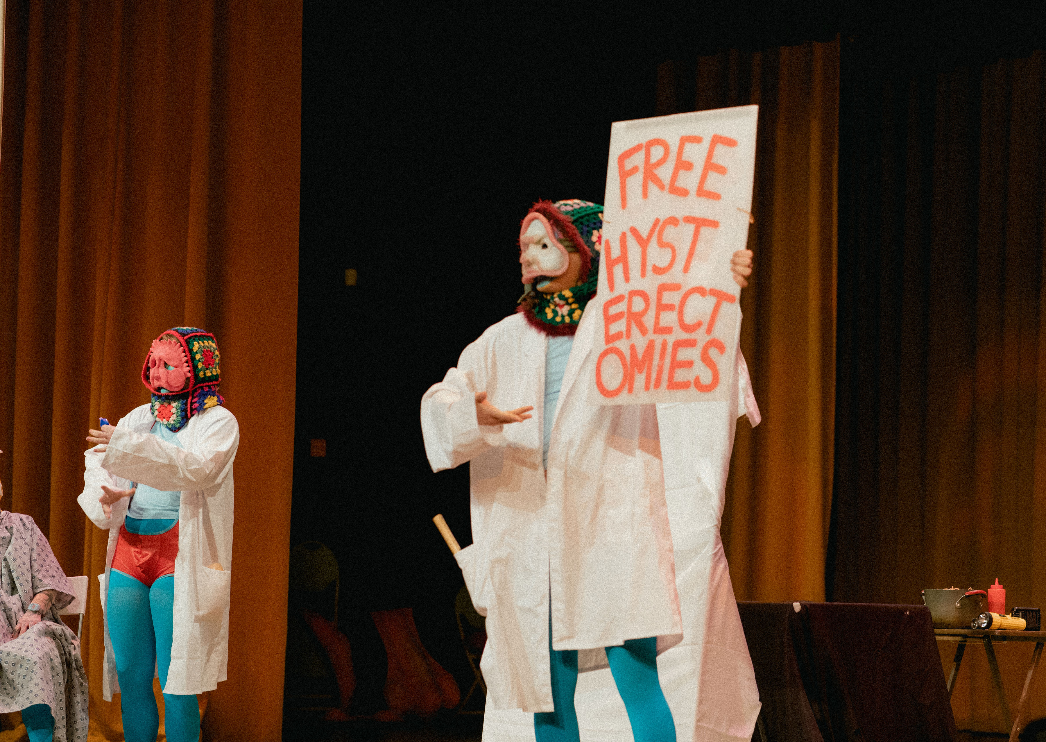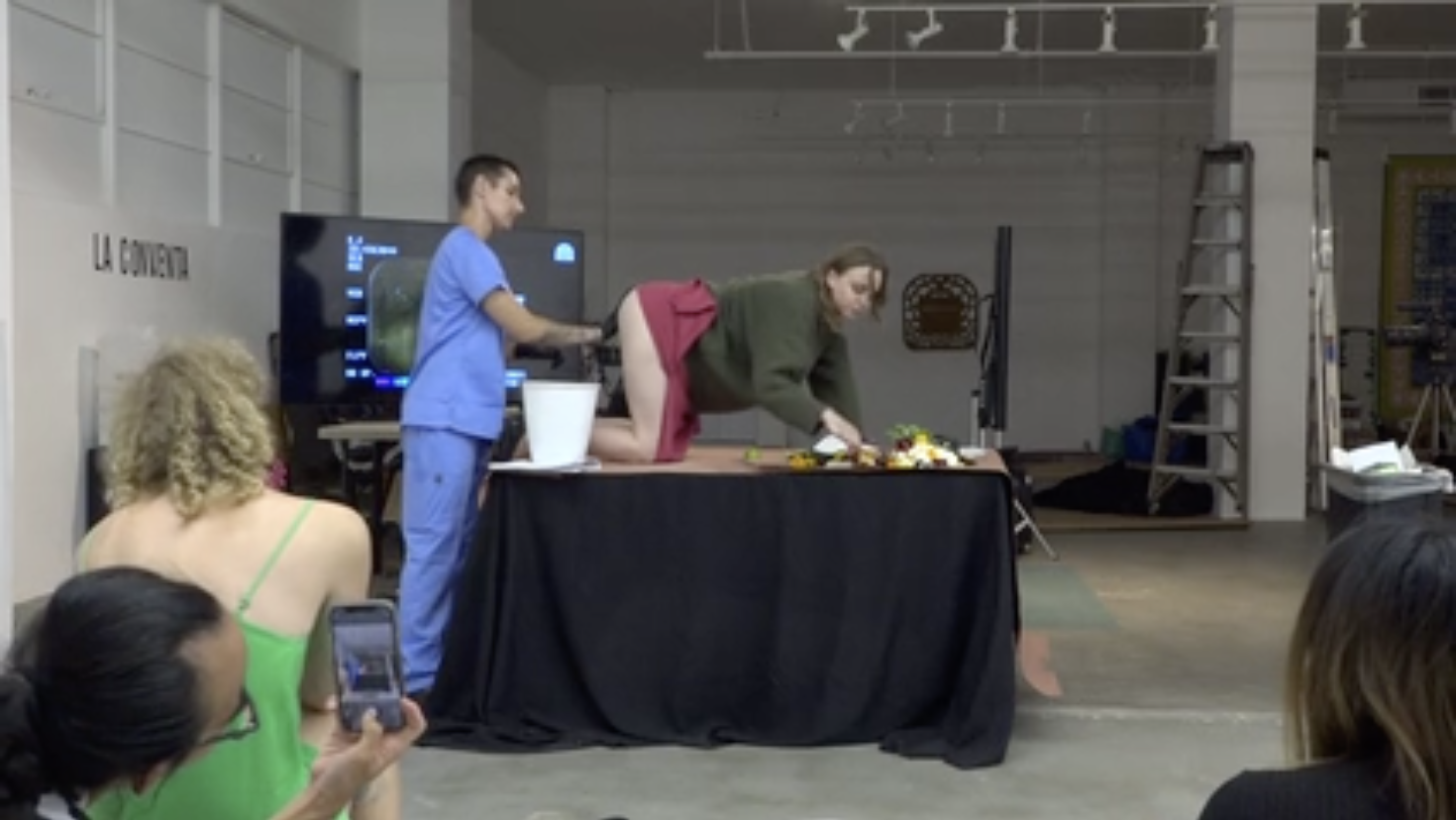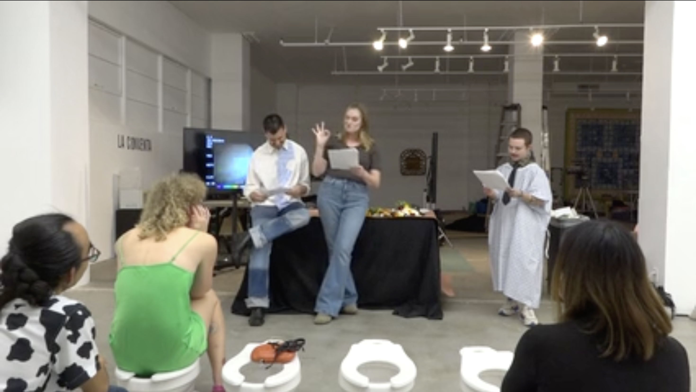 "Katie Couric Reflects on her Colonoscopy and Excremental Philosophy - A Performative Lecture" Homework Fair, 1950 S Santa Fe Ave, Los Angeles, November 18, 2023. Produced by Holly Harrell & Bryan Morello. Photo courtesy of Holly Harrell.