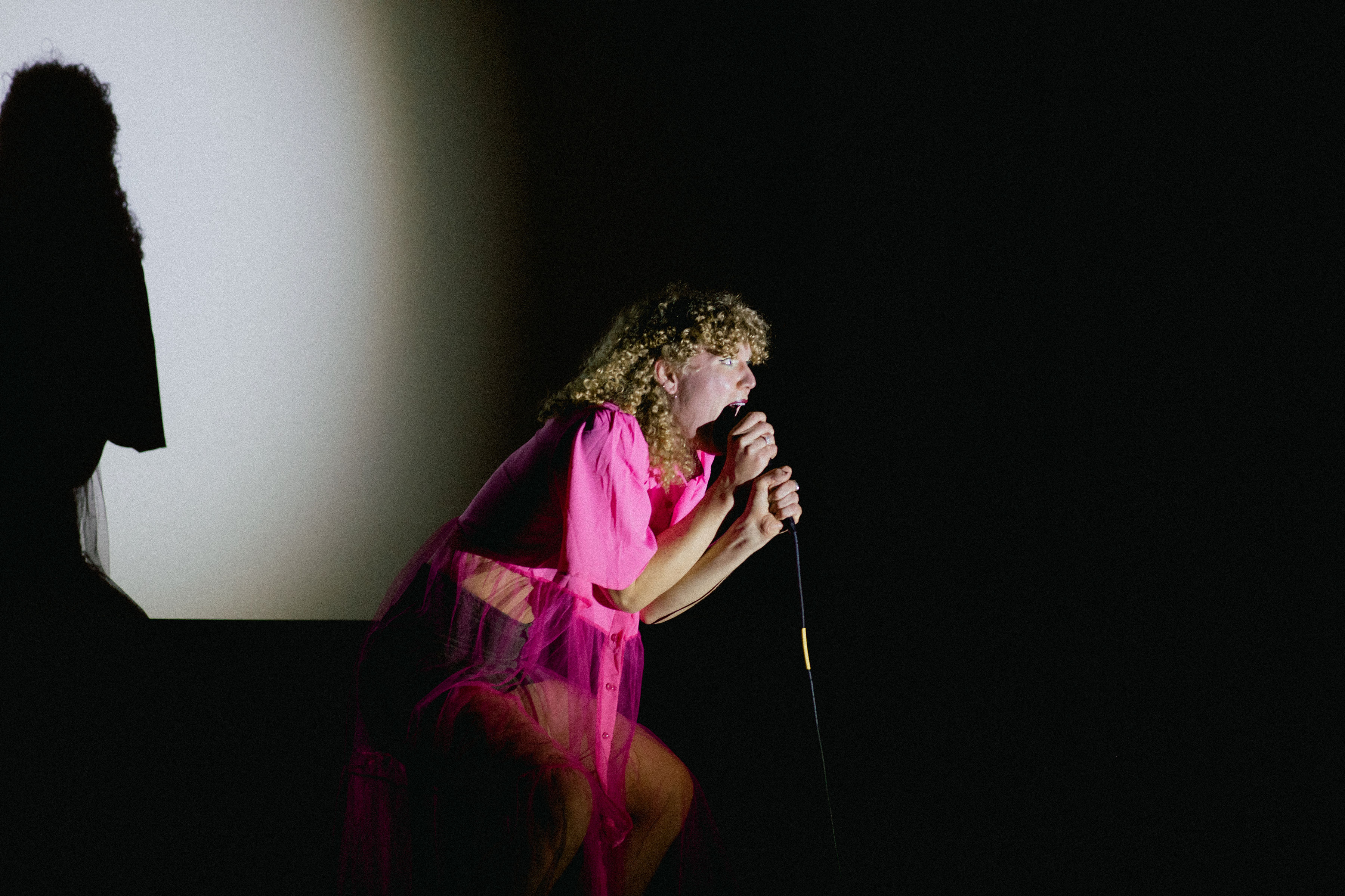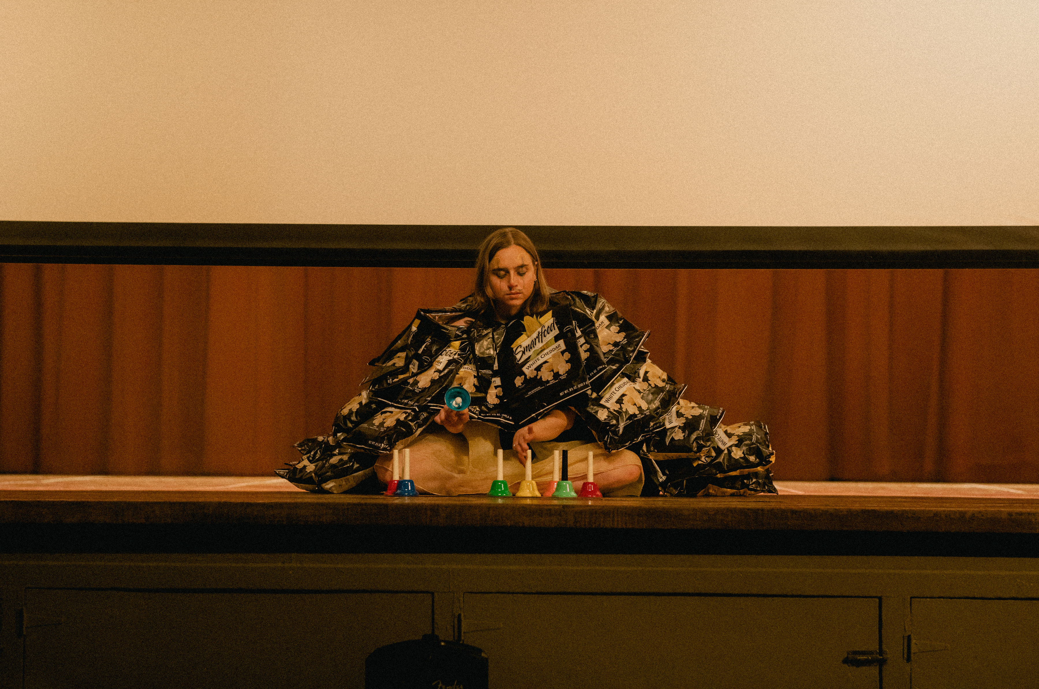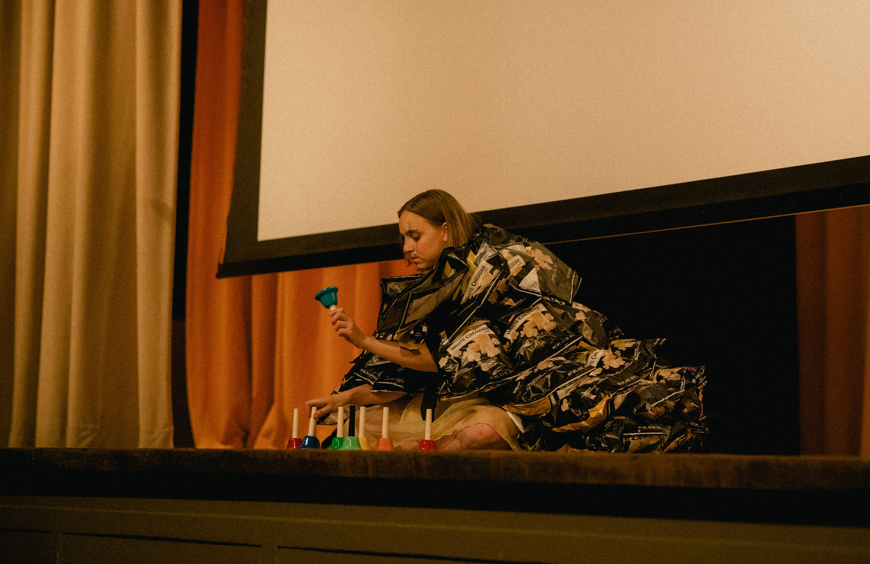 "Katie Couric Reflects on her Colonoscopy and Excremental Philosophy - A Performative Lecture" Homework Fair, 1950 S Santa Fe Ave, Los Angeles, November 18, 2023. Produced by Holly Harrell & Bryan Morello. Photo courtesy of Holly Harrell.